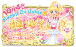 Character information kanji 神城カレン romaji kamishiro karen gender female birthday 4th october career profession top idol designer muse affiliations love metear star harmony academy (former) debut in dcd game part 1 more information zodiac libra blood type b idol type cute theme color yellow voice seiyū/singer azusa tadokoro What does the term brand mean in aikatsu? Karen is described to be very ladylike and princess like. Since she was also given proper japanese education amongst even royalty, she is very much the yamato nadeshiko type She is a graduate of star harmony academy and is now in her second year of high school.